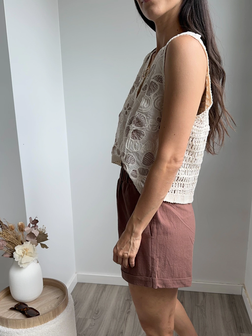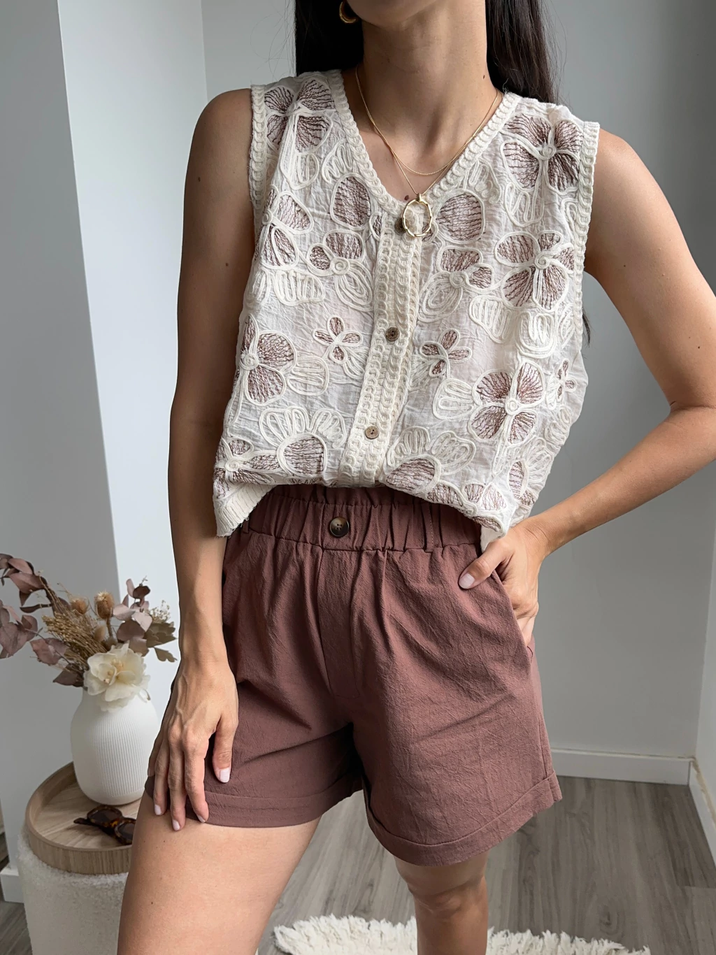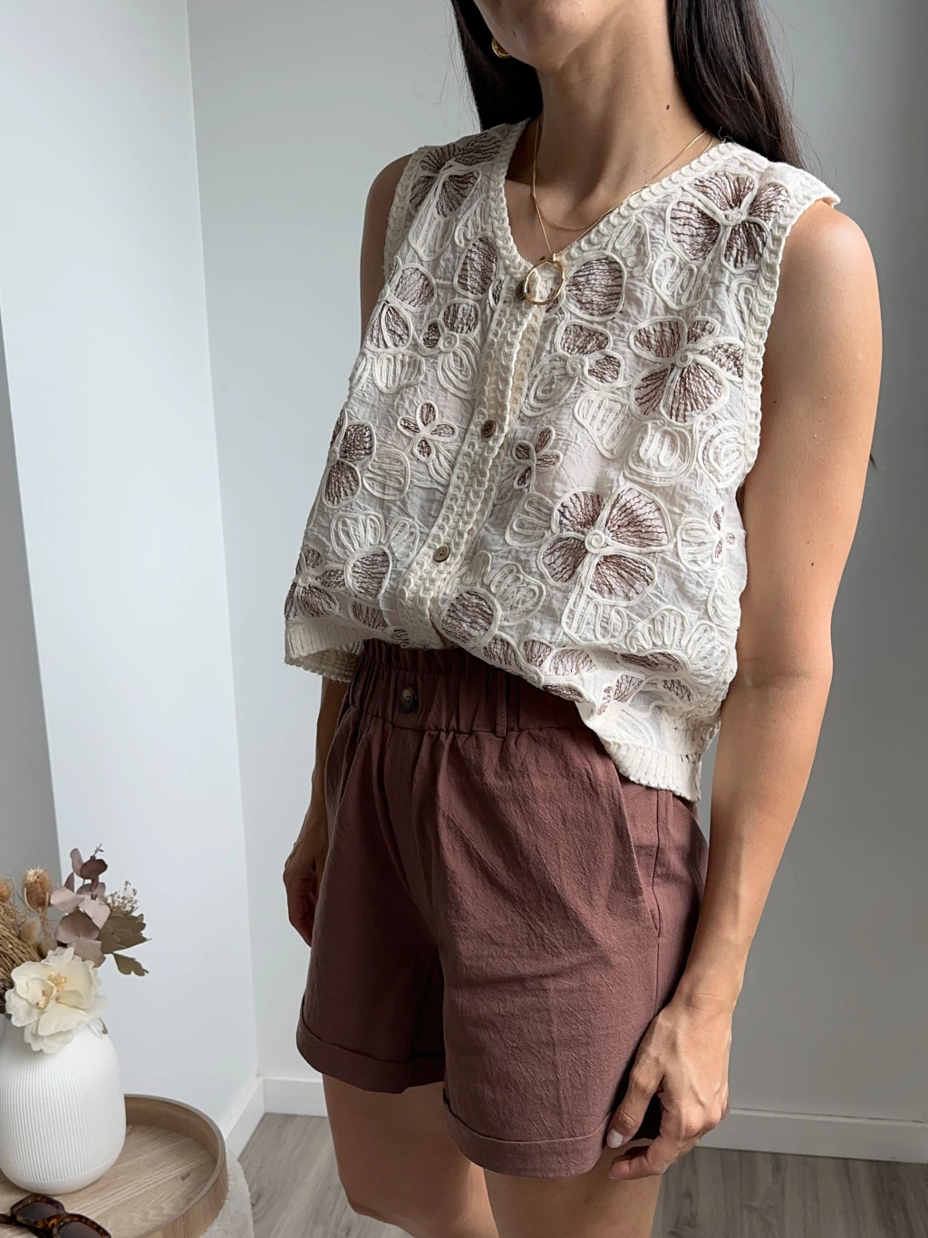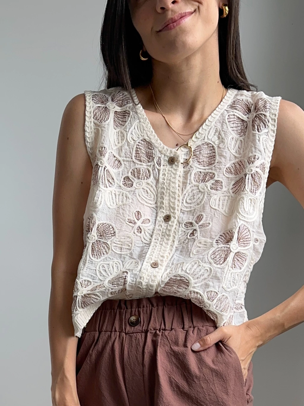 Blusa bordada con detalle de florcitas en chocolate y tejido fantasia en espalda