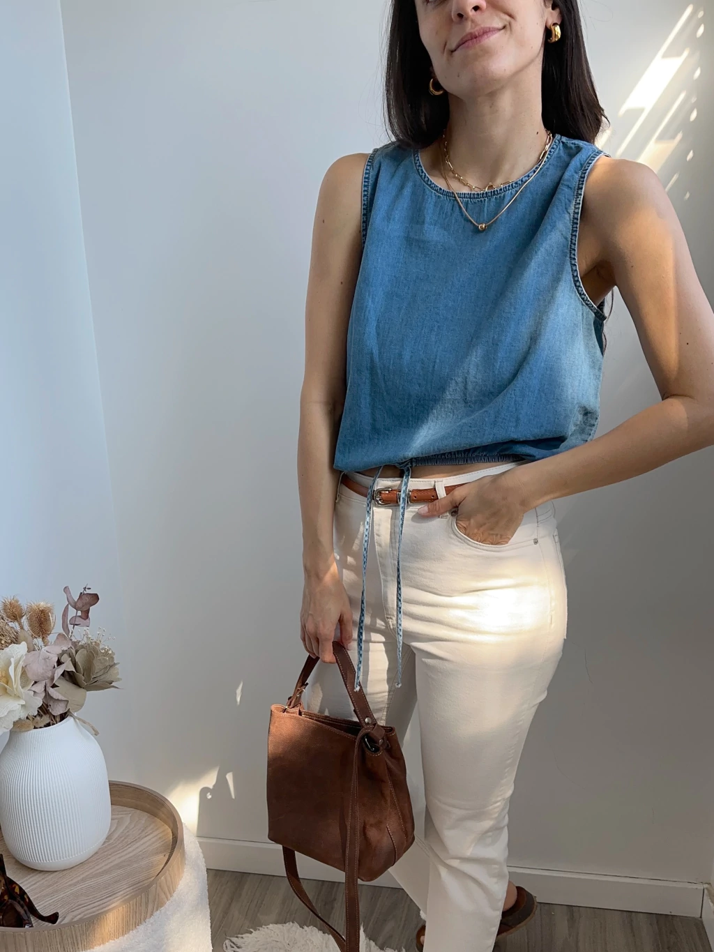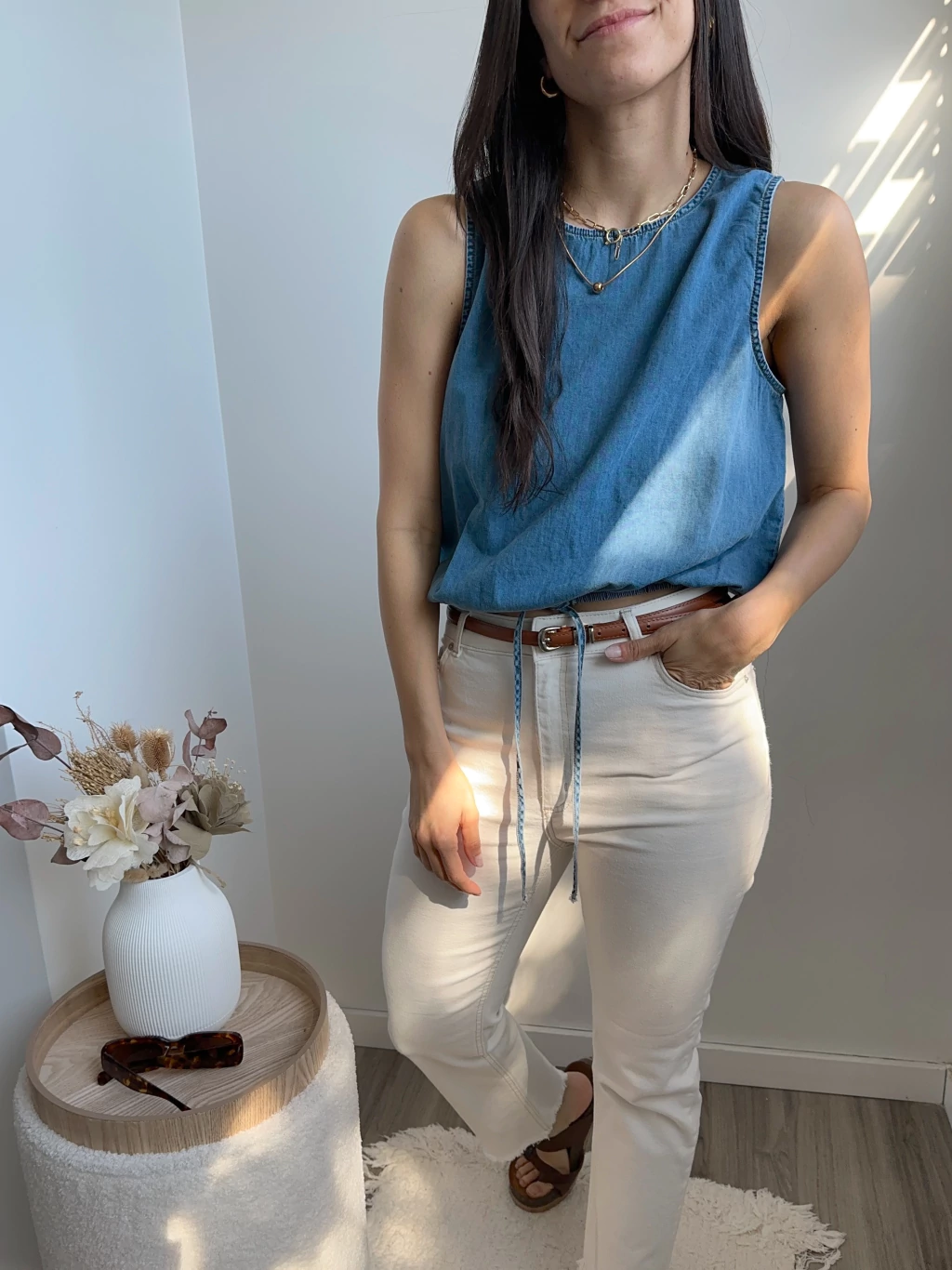 Blusa básica simil jean con terminacion de elastico y tirita para atar.