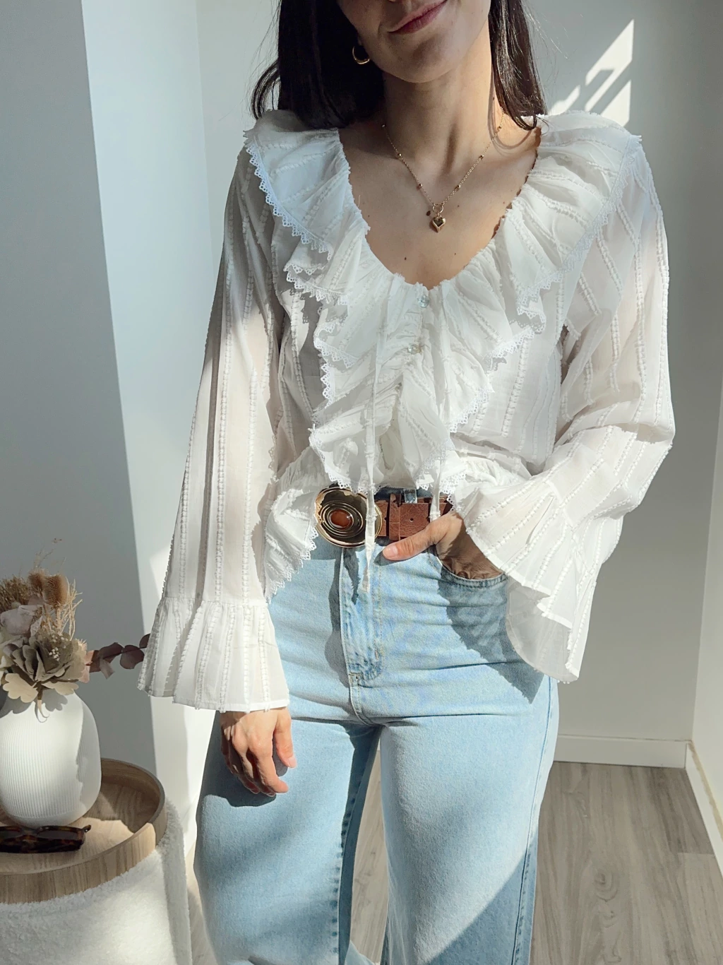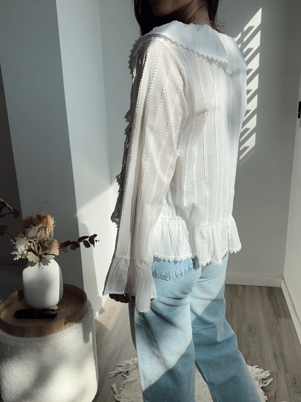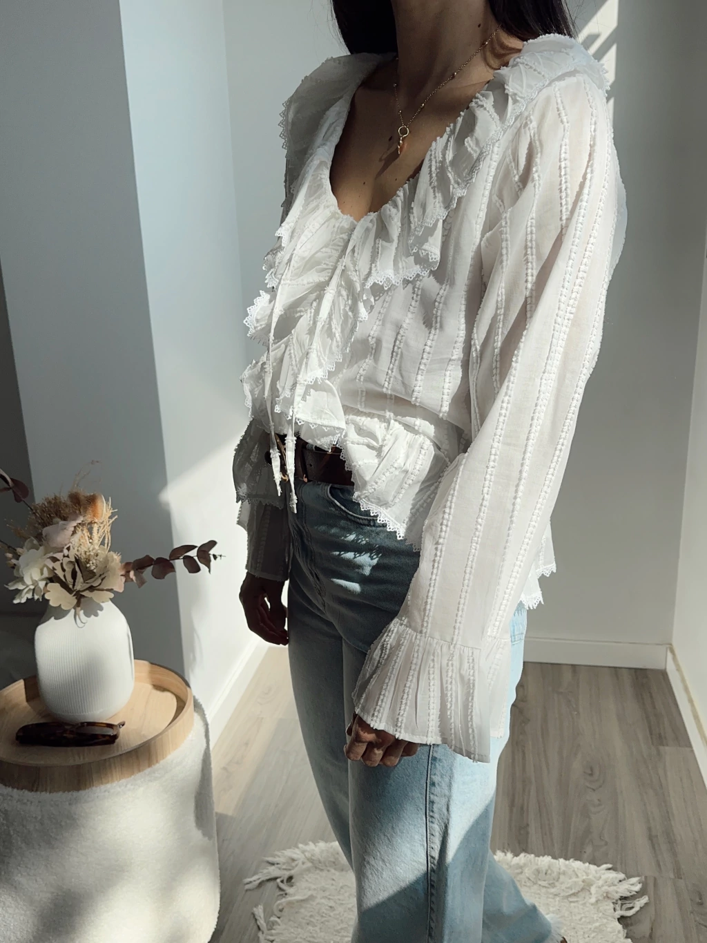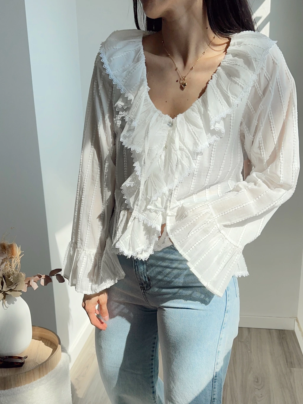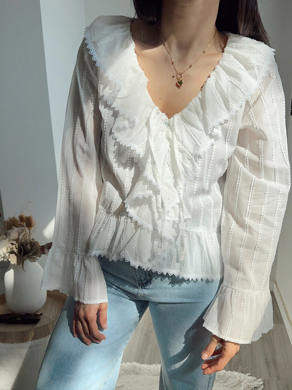 Blusa escote v con volados plumeti y botones nacar, detalles de alforzas en costura.