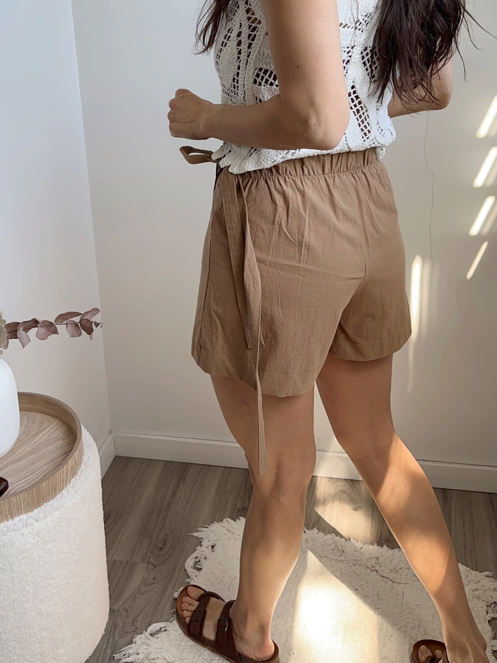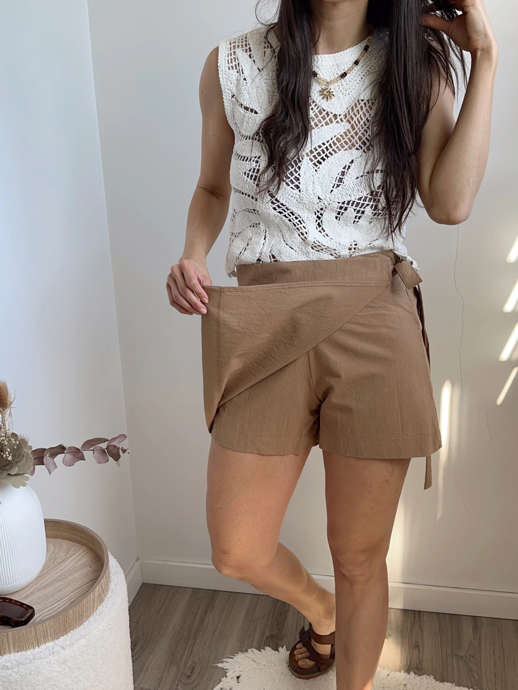 Skort cruzado de lino rustico con lazo para atar, cintura elastica.