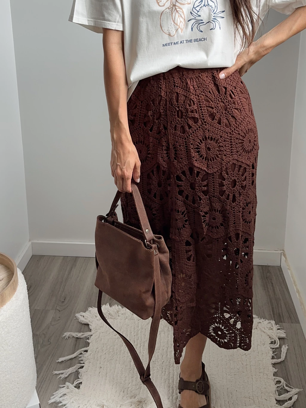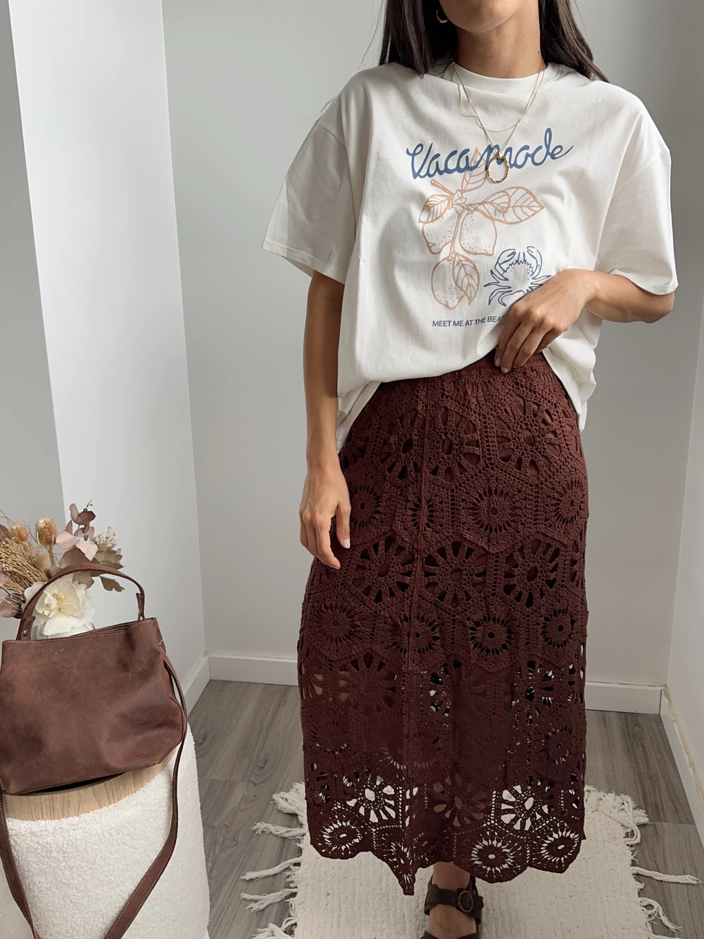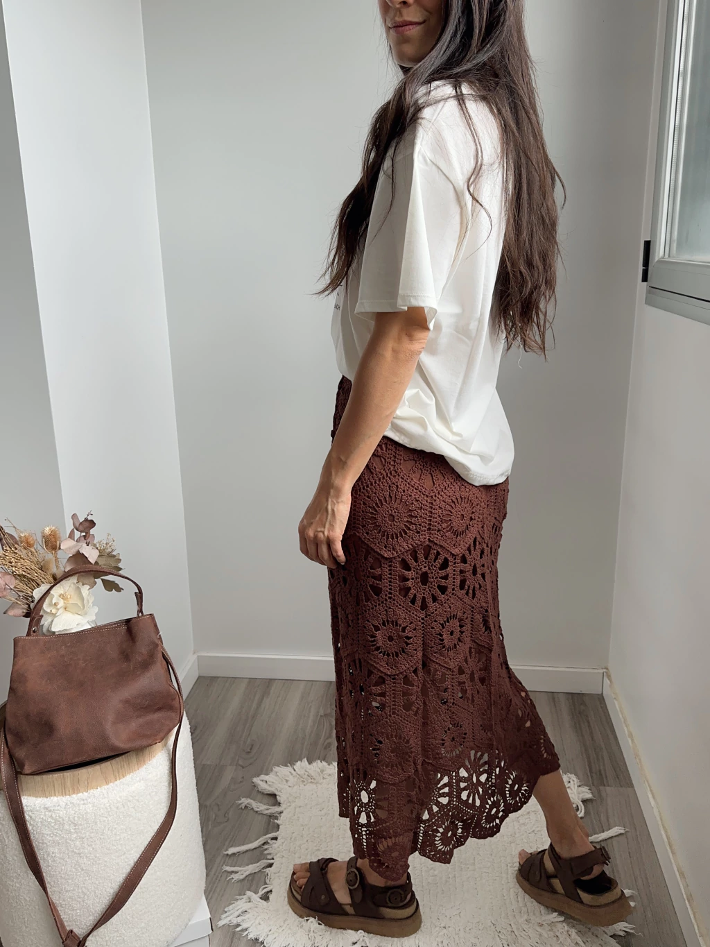 Pollera larga de hilo, detalle de flores en el tejido con elastico en cintura.