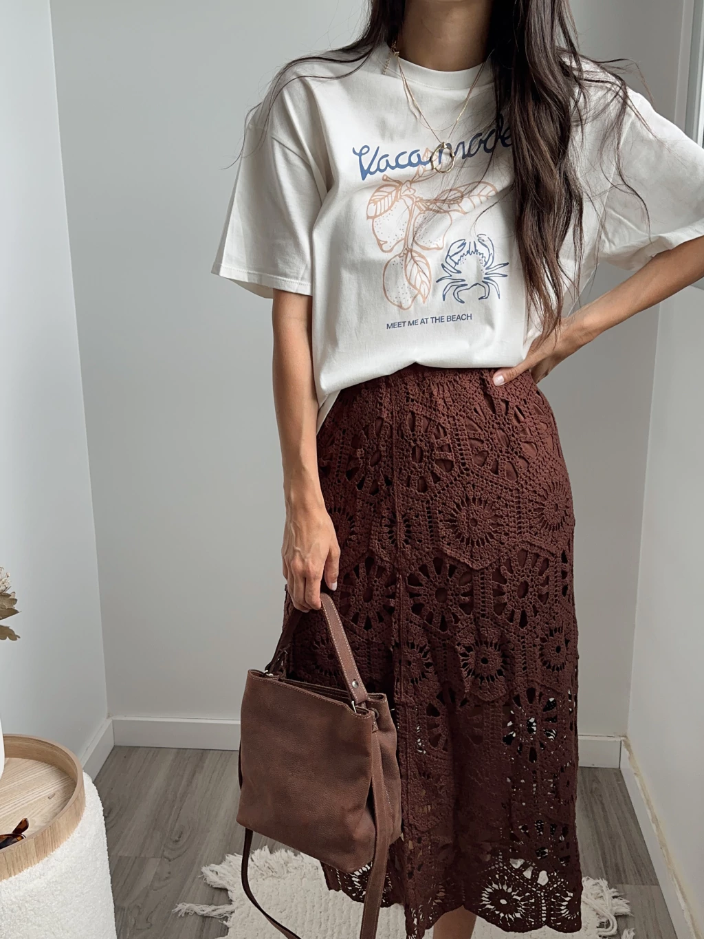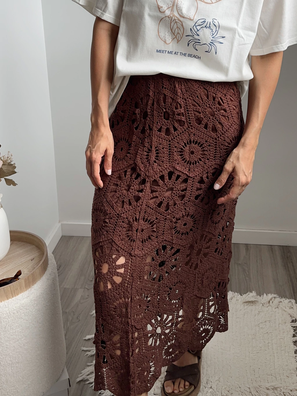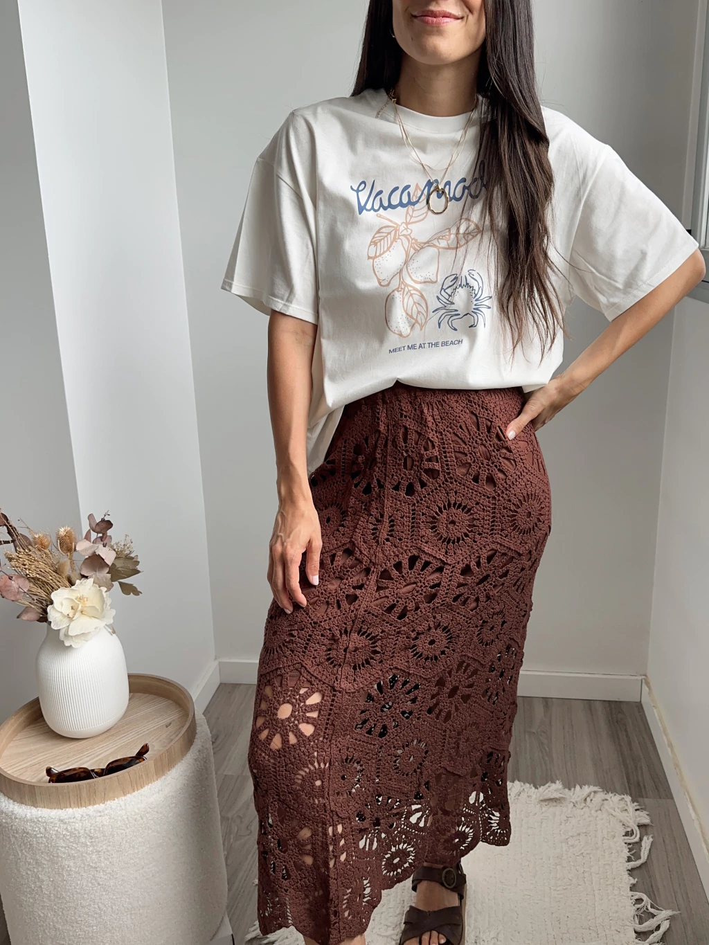 Pollera larga de hilo, detalle de flores en el tejido con elastico en cintura.