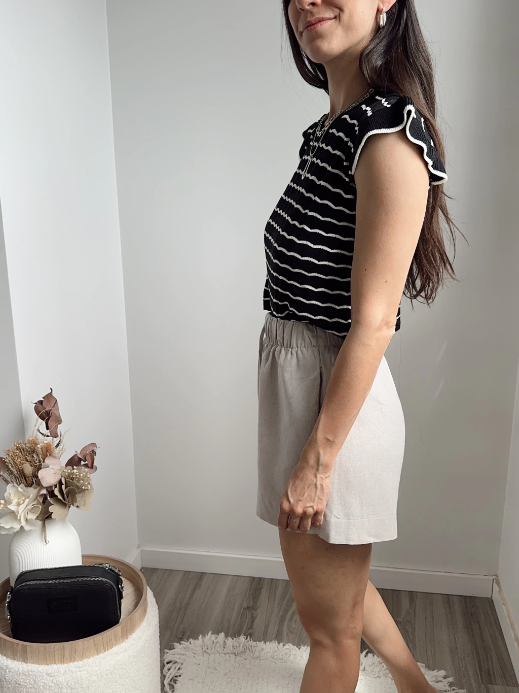 Short lino con elastico en cintura, en las tiritas detalle de bolitas marrones