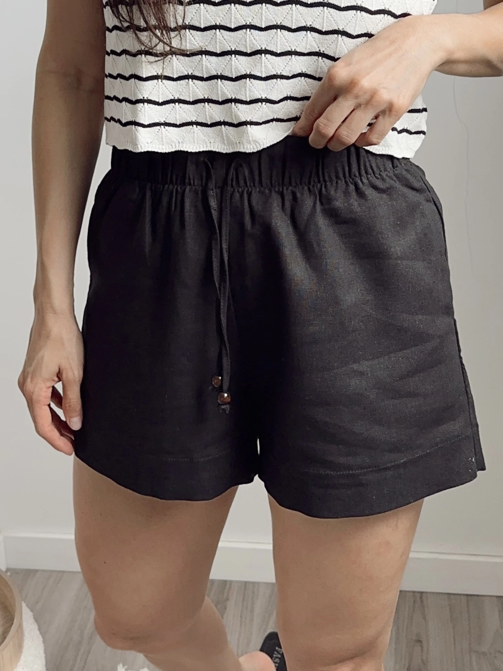 Short lino con elastico en cintura, en las tiritas detalle de bolitas marrones